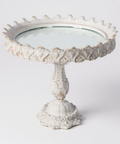 Realizzata in resina decorata con dettagli barocchi e finitura bianco anticato, presenta un piatto con bordo intagliato e un’elegante base lavorata a mano.