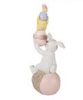 Questa statuetta decorativa con coniglio su uovo racconta una piccola storia primaverile: il coniglietto bianco è seduto su un uovo decorato e sostiene un secondo uovo sormontato da un dolce pulcino giallo, creando una composizione delicata e ricca di dettagli.
