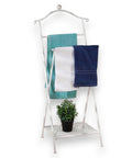 Realizzato in ferro verniciato bianco, unisce praticità e design grazie alle aste porta asciugamani e al ripiano inferiore perfetto per riporre piante, cestini o piccoli accessori.