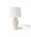 La base in ceramica lavorata presenta un grande fiocco scolpito, iconico del brand, mentre il paralume bianco diffonde una luce morbida e avvolgente, perfetta per camere da letto, salotti o ingressi.