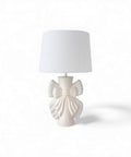 Una lampada da tavolo elegante e ricca di charme, caratterizzata da un fiocco scolpito in ceramica che rende la base un vero elemento decorativo. Il design morbido e raffinato, abbinato al paralume bianco, regala alla stanza una luce calda e avvolgente. Perfetta per camere romantiche, ingressi shabby chic, comò e consolle.