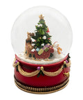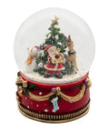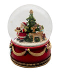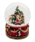 All’interno, una scena incantata con Babbo Natale, una renna e un albero addobbato, avvolta da una pioggia di glitter che si anima quando la palla viene agitata o accesa.