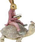 Questa statuetta raffigura un elegante coniglietto seduto sul dorso di una tartaruga, intento a leggere un libro, accompagnato da un piccolo uccellino: una scena che evoca calma, immaginazione e dolcezza senza tempo.