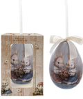 L'uovo presenta un'illustrazione finemente curata che ritrae due dolci coniglietti vestiti in stile vintage, immersi in un'atmosfera magica e fiorita. La finitura delicata e lucida è esaltata da un elegante fiocco in raso avorio posto sulla sommità, che permette di appendere la decorazione a rami pasquali, ganci o pomelli, rendendola un punto luce unico per il tuo arredamento Shabby Chic. Viene presentato in una splendida scatola coordinata con finestra, perfetta per un regalo di classe.