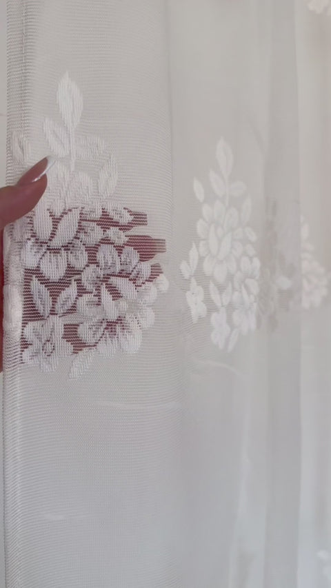 Delightful and versatile curtain in synthetic lace and tulle ruffles. The upper part of the curtain is characterized by four voluminous valance flounces, in contrasting or tone-on-tone colors, while the lower part is decorated with a romantic flounce and final scalloping. Each sheet measures 140x290 cm and can be hung on the rods thanks to the convenient laces.