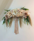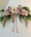 La composizione è caratterizzata da una ricca sequenza floreale nei toni delicati del rosa e del cipria, arricchita da foliage verde, elementi pendenti decorativi e lunghi nastri coordinati firmati Mata Creazioni, che donano movimento e verticalità all’insieme.