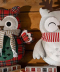 Búho de tartán rojo : cuerpo de tartán rojo/verde, vientre verde, bufanda de rayas beige