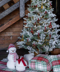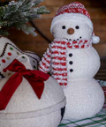 Un muñeco de nieve suave y dulce, con un gorro rojo, una bufanda roja y blanca y ribete bordado.